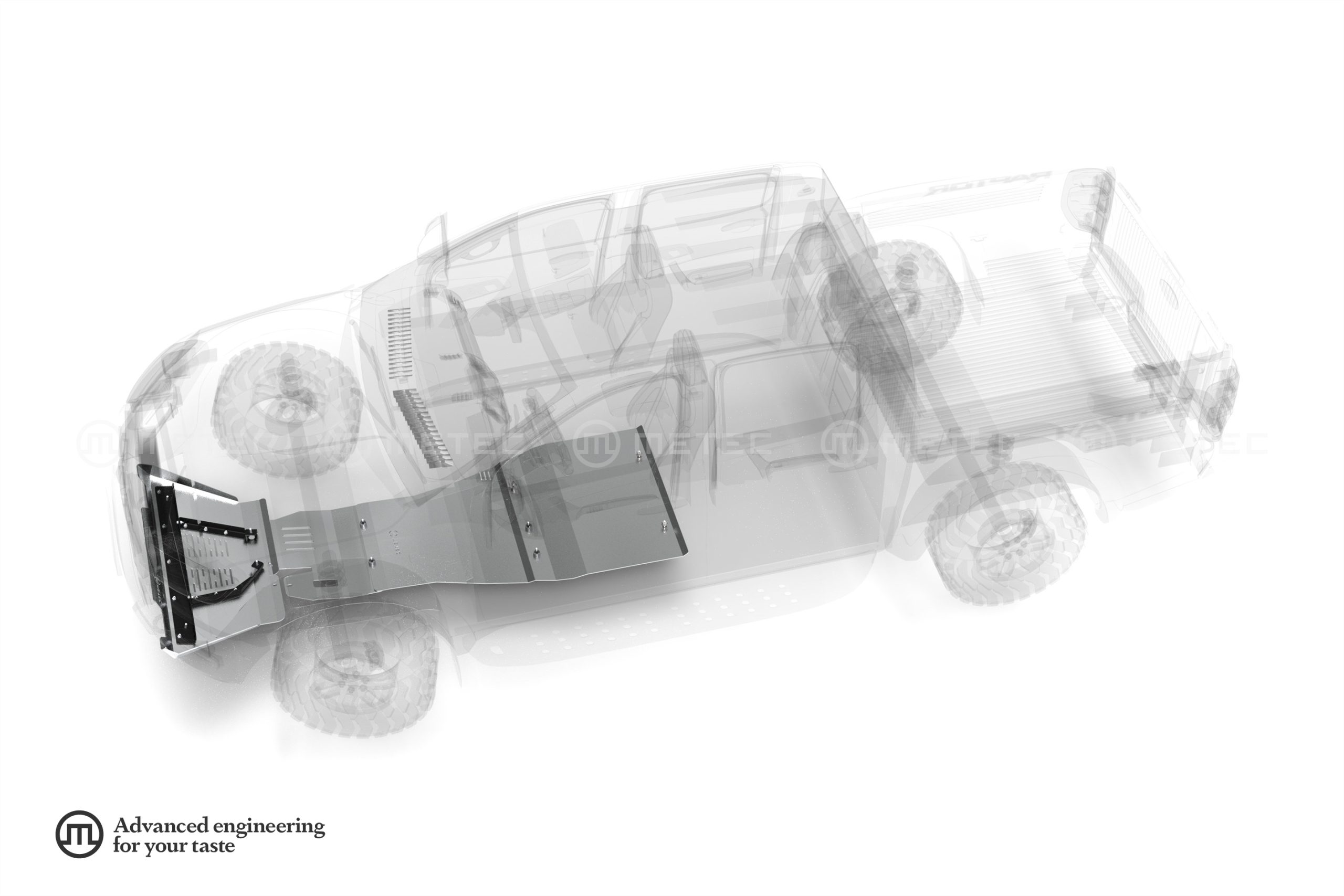 Zakrytí motoru, převodovky, rozvodovky, adblue nádrže, materiál hliník, tloušťka 5 mm, na všechny terénní vozy, na konkrétní typ vozu nás prosím kontaktujte.